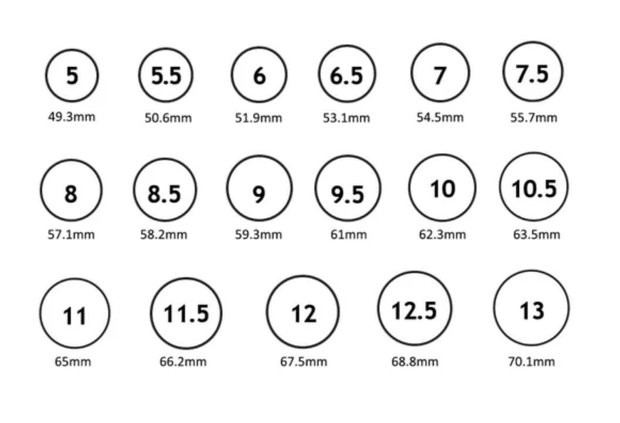 Mide la longitud que acabas de marcar con una regla y compárala con la tabla de tallas que se muestra a continuación para determinar el tamaño de tu anillo.